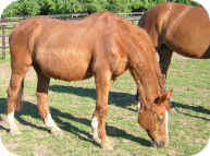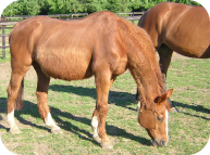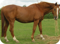 This horse was suffering incipient Cushings disease. This picture was taken in early June. Note the winter coat still on the belly, neck, and legs. Ten days later, more of the winter coat had been shed but a weight loss problem had become apparent.